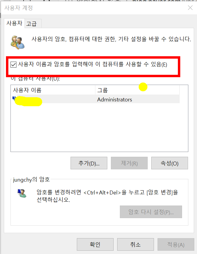 "사용자 이름과 암호를 입력해야 이 컴퓨터를 사용할 수 있음(E)" 에