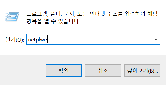 실행창이 뜨면 [netplwiz]를 치고 확인을 클릭합니다.