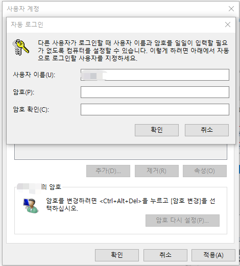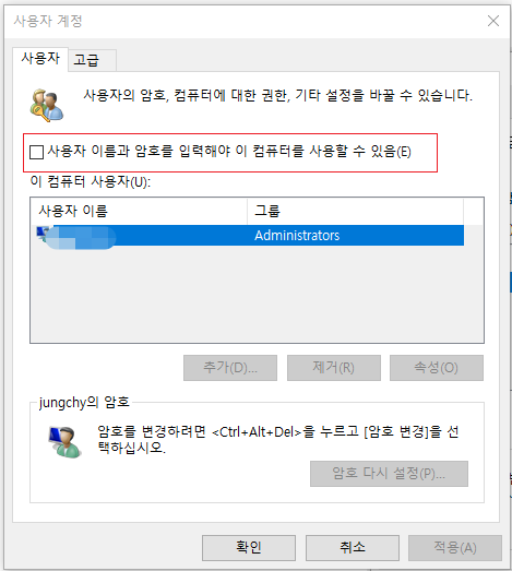 사용자 이름과 암호를 입력해야 이 컴퓨터를 사용할 수 있음(E)