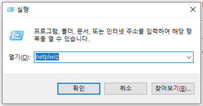 실행창에서 " netplwiz " 입력하고 확인을 클릭합니다
